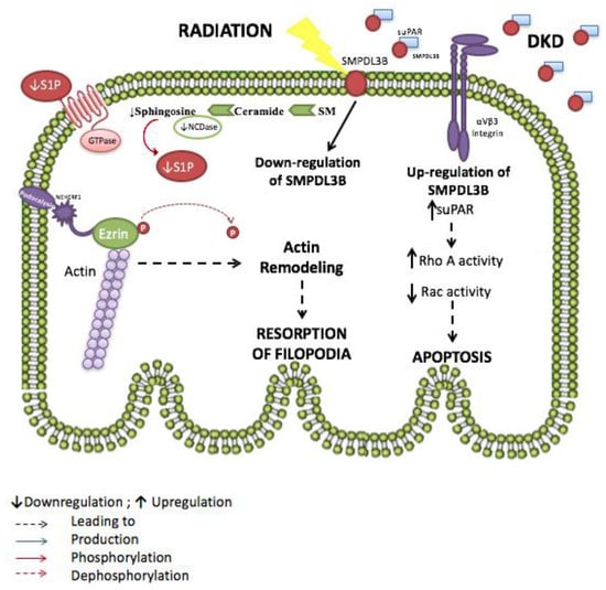 In fact, the observations described earlier correlate with the findings of our recent work aiming to study the molecular mechanisms involved in radiation-induced podocyte injury and radiation nephropathy. Exposure to radiation during abdominal or paraspinal cancer treatment usually affects different kidney components and the damage induced is proportional to the dosage and duration of radiotherapy. However, excessive exposure can lead to a syndrome of kidney failure called radiation nephropathy, which is, interestingly, a secondary cause for FSGS. This condition clinically manifests itself by proteinuria and reduced glomerular filtration rate and eventually leads to end-stage renal disease (ESRD), hence requiring either dialysis or transplantation [148,149,150,151,152]. In order to assess whether SMPDL3b plays a role in radiation-induced podocytopathy, podocytes were exposed to increasing doses of radiation. Within two hours after radiation, cultured human podocytes exhibited remarkable morphological changes. The actin-binding protein ezrin translocated from the cell periphery, where it stabilizes the link between the actin filaments and the plasma membrane, into the cytosol, resulting in cytoskeleton remodeling. Also, radiation led to decreased SMPDL3b protein levels, whereas overexpressing SMPDL3b protected podocytes from post-radiation ezrin relocation, cytoskeleton remodeling and apoptosis. Interestingly, when investigating cellular sphingolipid levels, an increase in ceramide levels after irradiation was observed in all the podocytes except those overexpressing SMPDL3b. In addition, a time-dependent drop in neutral ceramidase activity and in sphingosine and S1P levels were observed. The administration of exogenous S1P mitigated the radiation-induced cytoskeletal changes, thus proving the protective role of S1P against radiation injury. The proposed mechanism to explain these changes is that radiation induces downregulation of SMPDL3b thus altering sphingolipid metabolism by raising ceramide levels and decreasing sphingosine and S1P. This leads to a marked dysregulation of the cytoskeletal network within the podocyte, ultimately causing cellular injury which explains the observed clinical phenotype [153] (Figure 2).