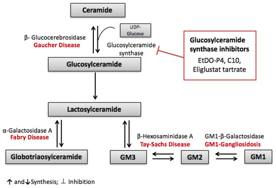 Although ERT is a very promising treatment for lipid storage disease, it alone is not able to reverse all the damage induced by these diseases. Substrate reduction theory, postulated by Norman Radin, is another possible therapeutic approach for lipid storage diseases [205]. Substrate reduction theory is based on reducing the accumulation of lipids by inhibiting their synthesis rather than correcting the initial enzymatic dysfunction. Slowing the biosynthesis of the accumulating lipid by synthesis inhibition would balance the rate of hydrolysis, thus preventing its accumulation and the resulting complications [206]. The substrate reduction theory was first carried on the lipid storage disease Gaucher disease type 1. Gaucher disease is a recessive autosomal disease characterized by a loss or lack of activity in β-glucocerebrosidase, leading to the accumulation of the sphingolipid glucosylceramide in lysosomes [207]. This glucosylceramide synthase is responsible for the synthesis of glucosylceramide from ceramide and UDP-glucose, a critical step in glucocerebroside-based glycosphingolipid pathway [208]. Further products of this pathway are globotriaosylceramide and gangliosides, as seen in Figure 3. These glycosphingolipids are involved in the pathology of even other lipid storage diseases such as Fabry’s, Tay Sachs and Gangliosidosis. Inhibiting the first step of this pathway therefore became a potential therapeutic target for these diseases replacing or complementing enzyme replacement therapy. PDMP was the first glucosylceramide synthase inhibitor designed and was found to be effective in reducing lipid accumulation over different cell lines and animal models of Fabry’s disease [205]. Even better, a derivative of PDMP called EtDO-P4 was tested on Fabry’s disease cellular models. As early as three days of treatment, approximately 70% of globotriaosylceramide was depleted [209]. A model of black C57BL/6 Fabry’s disease mice also showed a concentration-dependent decrease of glucosylceramide accumulation in kidney, liver and spleen after treatment with EtDO-P4 [210]. However, both Fabry’s and Gaucher disease exhibit accumulations of lipids in the CNS (central nervous system) involving neurological symptoms and leading to premature death, and since the mentioned pharmaceutical chemicals cannot cross the blood brain barrier [211], other glucosylceramide synthase inhibitors are currently in clinical development [212].