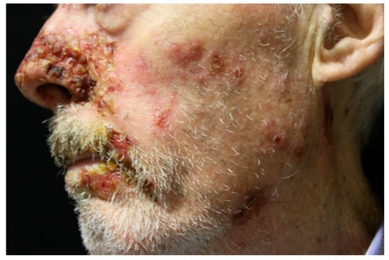 - Anhalt, G.J.; Kim, S.C.; Stanley, J.R.; Korman, N.J.; Jabs, D.A.; Kory, M.; Izumi, H.; Ratrie, H.; Mutasim, D., 3rd; Ariss-Abdo, L. Paraneoplastic pemphigus. An autoimmune mucocu-taneous disease associated with neoplasia. N. Engl. J. Med. 1990, 323, 1729–1735. [Google Scholar] [CrossRef] [PubMed]