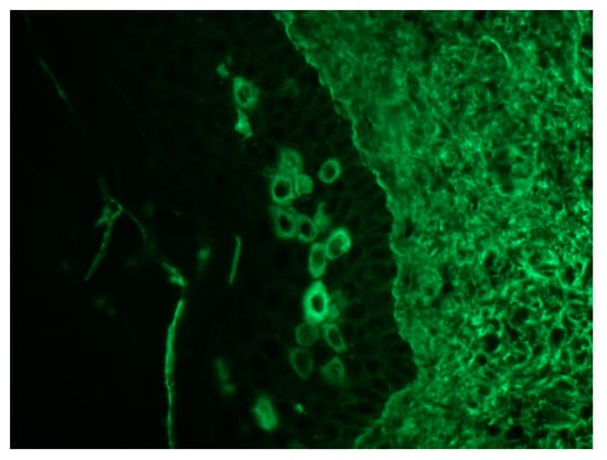 - Helou, J.; Allbritton, J.; Anhalt, G. Accuracy of indirect immunofluorescence in the diagnosis of para-neoplastic pemphigus. J. Am. Acad. Dermatol. 1995, 32, 441–447. [Google Scholar] [CrossRef]