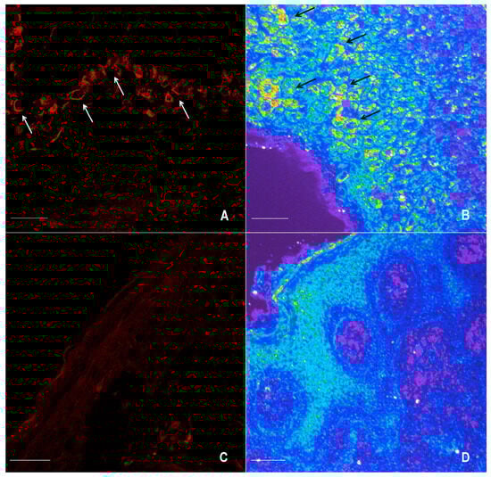 Normal skin: immunofluorescence staining of nNOS and iNOS (A,B). Confocal images obtained in “overlay” mode showed nNOS expression (arrows) in the sections (A,B); iNOS expression was not detected (C,D). The confocal image was “colored” and superimposed on a transmission image of the same skin area to show the exact localization of the reaction. Argon laser (568 nm) lens 3, zoom 1, original magnification 40×. (A,B) bar = 25 µm; (C) bar = 250 µm; (D) bar = 100 µm.
