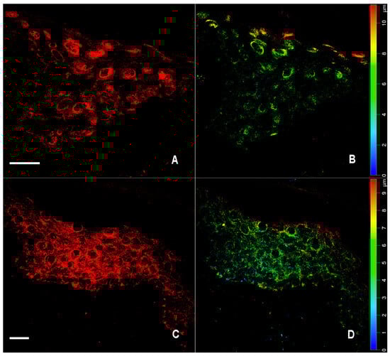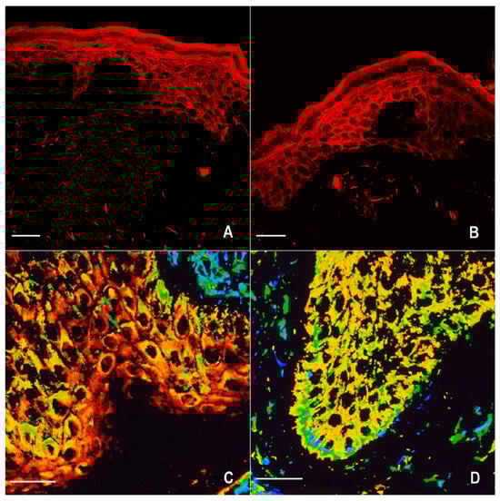 Inflammatory/lesional vitiligo skin: immunofluorescence staining of iNOS (A,B). Confocal image obtained in “overlay” mode showed a significant iNOS expression both in the basal and in suprabasal layer. iNOS expression was not observed in epidermal melanocytes. Argon laser (568 nm) lens 3, zoom 1, original magnification 40×. bar = 20 µm; (C,D) three-dimensional reconstruction obtained in depth coding mode. The colors reveal the spatial distribution (arrangement) of iNOS throughout the thickness of the section. (A,B) Argon laser (568 nm) lens 3, zoom 2, original magnification 40×. bar = 25 µm.