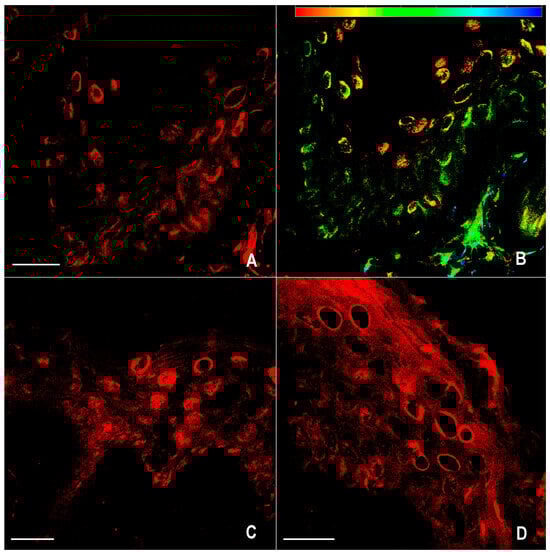 White/lesional vitiligo skin: immunofluorescence staining of nNOS (A–C); Confocal image obtained in “overlay” mode showed a moderate nNOS expression in white/lesional skin (B–D). Three-dimensional reconstruction of the same confocal image obtained in “depth coding” mode. The colors reveal the spatial distribution (arrangement) of nNOS throughout the thickness of the section. (A,B) Argon laser (568 nm) lens 3, zoom 1,2, original magnification 40×. bar = 25 µm; (C,D) Argon laser (568 nm) lens 3, zoom 1 , original magnification 40× bar = 20 µm.