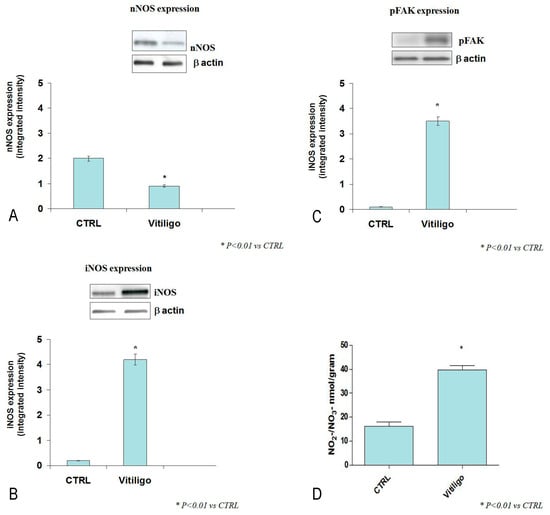Western Blot Analysis of nNOS (A); iNOS (B); and pFAK (C) in inflammatory/lesional skin. Lesional skin showed a reduced expression of nNOS and an increased expression of iNOS and pFAK. Samples were coded and the experiments were repeated three times; NO2−/NO3− levels (D) in vitiligo and control samples. Vitiligo skin samples showed increased production of NO2−/NO3− levels. * p < 0.01 compared to control group.