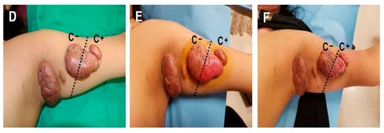 As shown in Figure 2A,B, the keloid lesion located at the chest wall responded well to the protocol in terms of redness and hypertrophy and the symptom improved for 2 weeks after cryotherapy. However, the lesion reverted to its original status after 2 weeks unless it was treated with cryotherapy (Figure 2C). However, the cryotherapy was ineffective for severe cases of keloid located at the upper arm and caused skin erosion at the site of cryotherapy; no volume reduction or shrinkage was reported (Figure 2D–F).