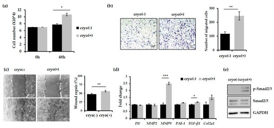 Cryotherapy increases the migration and proliferative activity of keloid dermal fibroblasts. (a) The comparison of the proliferative activity of the dermal fibroblasts from keloids before and after cryotherapy. Cell proliferation was promoted in the fibroblast treated with cryotherapy. The cell number was estimated at 48 h after cell seeding; (b,c) The migration activity of dermal fibroblasts was increased following cryotherapy. The migration of the cells was analysed by the transwell assay (b) and wound-healing assay (c); (d) qRT-PCR experiments were performed to evaluate the mRNA levels of fibronectin, MMP2 (Matrix metalloproteinase 2), MMP9, PAI-1 (Plasminogen activator inhibitor-1), TGF-β1, and Col2a1 (Collagen Type II Alpha 1) in fibroblasts derived from the dermis under the cryotherapy-treated (+) or untreated (−) keloids. MMP9 and TGF-β1 were significantly increased in the fibroblast treated with cryotherapy as compared with controls; (e) Immunoblot analysis of phosphorylated Smad2/3. Total Smad2/3 and GAPDH were used as the loading controls. Error bars represent the standard error from three repeated experiments. * p < 0.05, ** p < 0.01, and *** p < 0.005 (Student’s t-test).