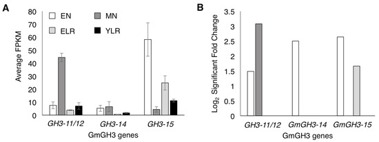 GmGH3-11/12 was expressed in all four lateral organ tissues examined with highest expression in mature nodule tissues (Figure 1A). It showed enrichment only in nodule tissues with a 3.1-fold log2 fold change in MN followed by 1.5 in EN (Figure 1B). Expression of GmGH3-14 and GmGH3-15 was detected in all four lateral organ tissues. Despite near equal expression in EN and MN tissues, GmGH3-14 expression was enriched only in EN tissues (Figure 1A,B). GmGH3-15 was expressed at relatively higher levels than GmGH3-14 in general, and was enriched in both EN and ELR with log2 fold change values of 2.6 and 1.7, respectively (Figure 1A,B).