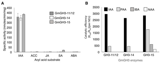 GH3 proteins are capable of generating conjugates of different plant hormones including jasmonic acid, IAA and other auxins, and benzoate-derived compounds [23]. Therefore, steady-state kinetic assays were performed using IAA, the ethylene precursor 1-aminocyclopropane carboxylic acid (ACC), abscisic acid (ABA), jasmonic acid (JA), and salicylic acid (SA) to further examine substrate preference (Figure 3A). GmGH3-11/12, GmGH3-14, and GmGH3-15 exhibited little to no activity with ACC, ABA, JA, and SA (Figure 3A).