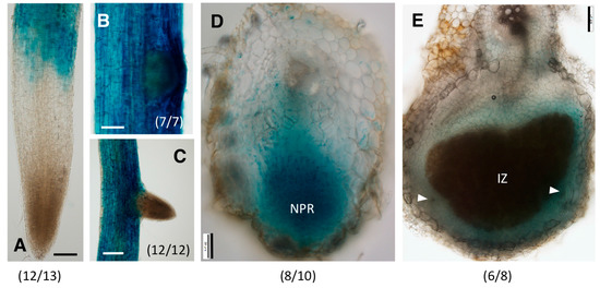 Expression patterns of GmGH3-14p:GUS in soybean roots and nodules. (A–C) Expression of GmGH3-14p:GUS in (A) root tips; (B) mature root region with a lateral root primordium; and (C) mature root region with a young lateral root; (D,E) Expression of GmGH3-14p:GUS in (D) emerging nodule (transverse section at 10 dpi); and (E) mature nodule (transverse section at 17 dpi). NPR-nodule primordium; IZ–infection zone; Arrowheads indicate nodule vascular bundles. The number of independent transgenic roots/nodules showing the representative staining pattern out of the number of roots/nodules examined is indicated in each panel. Scale bars: (A,B,E) 100 μm; (C) 200 μm; (D) 50 μm.