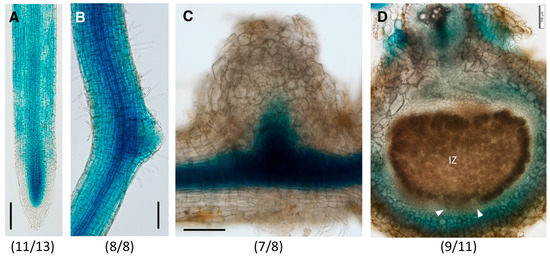 - Pacios-Bras, C.; Schlaman, H.R.M.; Boot, K.; Admiraal, P.; Mateos Langerak, J.; Stougaard, J.; Spaink, H.P. Auxin distribution in Lotus japonicus during root nodule development. Plant Mol. Biol. 2003, 52, 1169–1180. [Google Scholar] [CrossRef] [PubMed]