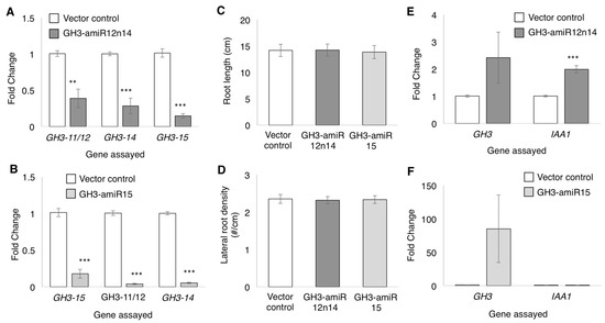 To evaluate the role of GmGH3 proteins in soybean nodule development, we sought to knock down their expression in soybean composite plants. High sequence similarity among family members precluded the use of RNAi; therefore, artificial miRNAs to independently silence GmGH3-14 and GmGH3-15 were designed ([50]; Figure S1). The high sequence similarity between GmGH3-14 and GmGH3-11/12 made it difficult to design a specific artificial miRNA construct against GmGH3-14. Therefore, the amiRNA against GmGH3-14 was expected to silence both GmGH3-11/12 and GmGH3-14 and was named GH3-amiR12n14. The amiRNA targeting GmGH3-15 was named GH3-amiR15. The amiRNA sequences were synthesized using gma-miR164 pri-miRNA as backbone (Figure S1) and expressed using the constitutive CsVMV promoter [51] in soybean hairy root composite plants. The “empty vector”, pCAMGFP-CsVMV:GW was used to generate vector control hairy root composite plants. To evalute amiRNA-mediated gene silencing, the expression of GmGH3 genes were quantified using RT-qPCR (Figure 6). The expression levels of the corresponding targets were significantly reduced in roots expressing GH3-amiR12n14 and GH3-amiR15 compared to the vector control roots (Figure 6A,B). However, the amiRNAs also led to the reduction in expression levels of non-target GH3 genes (Figure 6A,B). GH3-amiR12n14 led to reduction in the levels of GmGH3-15; and GH3-amiR15 led to a significant reduction in the expression levels of GmGH3-11/12 and GmGH3-14 (Figure 6A,B). GH3-amiR15 led to >95% reduction in GmGH3-11/12 and GmGH3-14 expression where as GH3-amiR12n14 led to ~60–70% reduction of these genes. Despite the silencing of non-target GH3 genes, we expected that suppression of GH3 expression in these roots might lead to a reduction in IAA-Asp formation, resulting in an increased active auxin pool. As a proxy for increased active auxin levels, we measured root length and lateral root density (number of lateral roots/cm of primary root) in these roots. There was no significant differences in these phenotypes in either of the GH3-amiR expressing roots relative to the vector control roots (Figure 6C,D). We also assayed the expression of auxin response marker GH3 (not targeted by the amiRNA) and INDOLE ACETIC ACID1 (IAA1) as a proxy for increased auxin levels. We observed 2.4-fold and 72-fold increases in expression of auxin-responsive GH3 in GH3-amiR12n14 roots and GH3-amiR15 roots, respectively. However, The differences were not statistically significant due to high variation between biological replicates (Figure 6E,F). IAA1 showed a statistically significant 2-fold higher expression in GH3-amiR12n14 roots, but no change in GH3-amiR15 roots compared to vector control roots. While physiological assays such as root length and lateral root density are likely to indicate cumulative effects of potential changes in auxin levels, gene expression markers are typically indicative of responses at the time of tissue harvest. This is likely the reason for inconsistency between markers, and large variation among replicates.