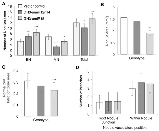 Nodule numbers and morphology in GH3-amiR expressing soybean roots. (A) Numbers of emerging, mature, and total nodules in vector control, GH3-amiR12n14, and GH3-amiR15 expressing roots at 17 dpi. Data shown are the averages of at least 68 roots for each construct from three independent experiments. Error bars indicate SE. * p < 0.05, *** p < 0.001, Poisson distribution test; (B) Nodule area; and (C) normalized infection zone size of mature nodules from vector control, GH3-amiR12n14, and GH3-amiR15 expressing roots. Data shown are averages of at least 15 nodules each from three biological replicates. Error bars indicate SE. ** p < 0.01, *** p < 0.001, Wilcoxon-Mann-Whitney test; (D) Number of vasculature branches detectable at the root-nodule junction and within the nodule in transverse sections of mature nodules from vector control, GH3-amiR12n14, and GH3-amiR15 expressing roots. Data shown in C are averages of at least 15 nodules each from three biological replicates. Error bars indicate SE. Student’s t-test.