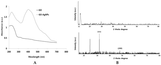 Graphene is a single atomic plane layer of graphite, and graphene oxide is prepared from exfoliation of graphite oxide. It can produce different dispersion forms with different long-term stabilities and single layer GO thickness [33]. The UV-vis spectra of aqueous GO dispersions are presented in Figure 1A. GO shows typical characteristics features such as a shoulder at ~300 nm, corresponding to an n–π* plasmon peak and a feature at 230 nm corresponding to a π–π* plasmon peak. The intensity and position of this feature vary between samples depending on type of solvent used, sonication time and several other factors [33]. GO-AgNPs were also confirmed by UV-visible spectra. As shown in Figure 1A, the AgNPs attached on the layer of graphene show a typical characteristic peak at 410 nm, which was consistent with the surface plasmon resonance phenomena of AgNPs formulation [34], while GO exhibited a typical peak around 230 nm corresponding to the C=C aromatic bonding.