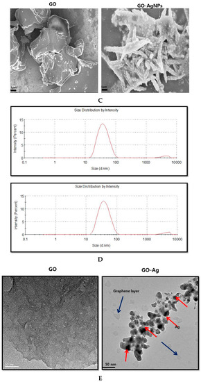Toxicity or beneficial effects of any nanoparticle depend on size, morphology, size distribution, particle composition, surface area, surface chemistry, and particle reactivity in solution. DLS was used to determine the size of the particle in solution, which is very useful technique to evaluate particle size and size distribution of nanomaterials in solution [19,20]. Therefore, we examined the size distribution of GO and GO-AgNPs. The size distribution of both GO and GO-AgNPs was between 10 and 100 nm, with an average size of 50 nm (Figure 1D). The size distribution of the AgNPs and GO-AgNPs nanoparticles suspended in water seems to be slightly larger in size than the size in TEM analysis because the hydrodynamic size is usually affected by surface charge of particles.
