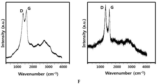 Finally, we performed the Raman spectroscopy to characterize the structural and electronic properties of GO nanosheets and the interaction between GO and AgNPs, including the disorder, crystal structure, defects and doping levels of graphite, GO and graphene-based materials and nanocomposites [18,19,20] Figure 1F shows the Raman spectra of GO before and after AgNPs were absorbed on its surface. Two characteristic D and G bands of GO were observed at around 1381 cm−1 and 1587 cm−1, whereas GO-AgNPs exhibited the two characteristic D and G bands at around 1367 cm−1 and 1599 cm−1, respectively. The D band provides information on the breathing mode of the κ-point, and the G band relates to the tangential stretching mode of the E2g phonon of the sp2 carbon atom [18,19,20,33]. Interestingly, the intensities of these two bands between GO and GO-AgNPs were enhanced significantly from 1.4 to 1.9 after the decoration of AgNPs on the surface of GO due to the surface-enhanced Raman spectroscopy (SERS) of AgNPs (Figure 1F). All these characterization results indicated the successful GO synthesis and decoration of AgNPs on the surface of graphene sheets using luciferin as reducing agents.