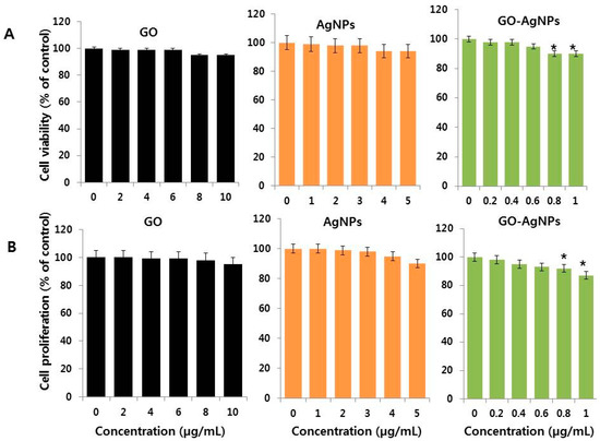 Cell proliferation was determined according to method described earlier [85] and also manufacturer’s instructions (Thermo Fisher, Waltham, MA, USA). Cells were incubated with various concentrations of GO, AgNPs or GO-AgNPs for 24 h; the BrdU labeling solution was added to the culture medium 2 h before the end of the incubation. Cells were fixed and the level of incorporated BrdU was determined using the Cell Proliferation ELISA BrdU assay kit (Roche, Basel, Switzerland) following the manufacturer’s instructions. Proliferation activity of the untreated cells at the time point of 0 h was considered as 100%.