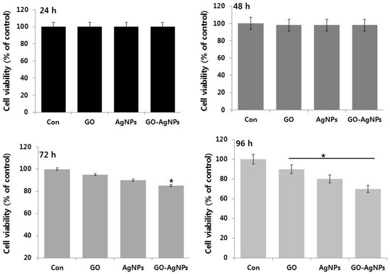 Next, we examined the effect of various time points on cell viability of SH-SY5Y cells. To quantify the effects of various time points, the cell growth rate was observed in the presence or absence of various nanomaterials such as GO (10 µg/mL), AgNPs (5 µg/mL) and GO-AgNPs (1.0 µg/mL) for 24, 48, 72 and 96 h (Figure 3). The results suggest that GO (10 µg/mL), AgNPs (5 µg/mL) and GO-AgNPs (1.0 µg/mL) did not exert any significant effect up to 48 h. However, when increasing time of incubation, trivial cell viability loss was observed. In agreement with previous reports, GO presented no cytotoxicity at a concentration lower than 80 µg/mL and it exhibited higher toxicity for SH-SY5Y cells when treated for the longer culture time at a concentration >80 µg/mL [17]. Hu et al. found that A549 cells remained viable with membrane integrity intact when cells were treated with culture medium containing 10% FBS and 100 µg/mL GO; that is GO can cause a dose-dependent oxidative stress in A549 cells but does not damage the cell membrane [41]. Our previous studies also confirmed that low concentration of GO has no effect on primary mouse embryonic fibroblast cells and human breast cancer cells [19]. Similarly, Dayem et al., reported that low concentration of AgNPs (0.2 µM) had no significant toxicity in SH-SY5Y cells [14]. A study was performed based on dose and time in both undifferentiated and differentiated human adipose-derived stem cells (hASC) cells using 10- and 20-nm AgNPs; the results revealed that no significant viability loss was observed in undifferentiated hASC. Similarly, the addition of either 10- or 20-nm AgNPs following hASC differentiation resulted in no significant decrease in viability of undifferentiated hASC at any concentration. Interestingly, the results from cytotoxicity assay of AgNPs revealed that both differentiated and undifferentiated human mesenchymal stem cells (hMSCs) treated with high silver concentrations (≥20 µg/mL) for 24 h showed cytotoxicity but not with low-concentration treatments (≤10 µg/mL). Altogether, the data from this study suggest that concentration of GO (10 µg/mL), AgNPs (5 µg/mL) or GO-AgNPs (1 µg/mL) had no significant toxicity in SH-SY5Y cells. Therefore, we selected 24 h treatment time for further experiments.