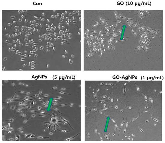 The effect of GO-AgNPs treatment on differentiation of SH-SY5Y cells. The GO-AgNPs induced differentiation of SH-SY5Y cells was determined after 24-h exposure to GO (10 µg/mL), AgNPs (5 µg/mL) and GO-AgNPs (1.0 µg/mL). Phase contrast microscopy images showing the morphological changes in SH-SY5Y cells after treatment with GO-AgNPs in 1% serum-supplemented medium. The green arrows indicate significant, lengthy neurite outgrowth. At least three independent experiments were performed for each sample. Scale bar is 100 μm.