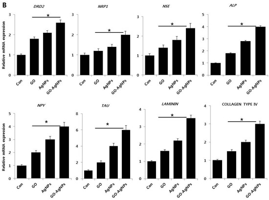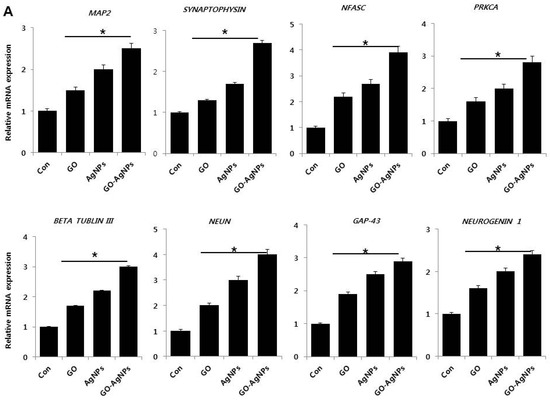 To gain evidence on whether GO-AgNPs could stimulate the expression various differentiation responsible genes within the cells, qRT-PCR was performed to determine the expression of various neuronal markers in SH-SY5Y cells in the presence and absence of GO, AgNPs and GO-AgNPs. The expression of the following genes were studied: microtubule-associated protein 2 (MAP2), synaptophysin, neurofascin (NFASC), protein kinase C, alpha (PRKCA), β tublin III, fox-1 homolog 3 (NEUN), growth associated protein 43 (GAP-43), neurogenin 1, dopamine receptors type 2 (DRD2), neuropilin 1 (NRP1), gamma neuronal (NSE), alkaline phosphatase (ALP), neuropeptide Y, (NPY), microtubule-associated protein tau (TAU), laminin, and collagen type IV. The relative expression level of all tested genes was observed as from 0.2 to 6 fold after treatment with GO, AgNPs and GO-AgNPs. The expression level was dependent on type of nanomaterials (Figure 5A,B). However, GO-AgNPs upregulated all of the above genes in higher level compared to the cells treated with GO or AgNPs. It suggests that GO-AgNPs could promote neuronal differentiation of SH-SY5Y cells. Among several genes tested, typical neuronal markers such as MAP2, TAU, NSE, and NEUN were up-regulated in a stronger manner. Similarly, Graser et al. found expression of MAP2, TAU, NSE, and NEUN at a higher level in tissue-nonspecific alkaline phosphatase in the human SH-SY5Y neuroblastoma cell line [35]. Dayem et al. found that AgNPs enhanced the expression of neuronal differentiation markers including markers Map-2, -β tubulin III, synaptophysin, neurogenin-1, Gap-43, and Drd-2, in SH-SY5Y cells [14]. Yang et al. demonstrated that hierarchical topographies of specific dimensions of graphene oxide (GO)-based patterned substrate (GPS) influence the expression of neuronal markers such as Tuj1 and MAP2 gene expression in human neural stem cells (hNSCs). They found that the expression level was significantly higher on the GPS with a 5 µm groove width compared to cells cultured on flat SiO2 substrates (FS) or GO-coated substrates (GS) [48]. Garcia-Alegria et al. observed an increased level of the expression of the hematopoietic genes Pu.1, MPO, CD45, and Gata1, which suggest that GO could promotes embryonic stem cell differentiation to hematopoietic lineage [26]. Altogether, the present findings suggest that the combination of GO and AgNPs could synergistically induce neuronal differentiation by increasing expression of various neuronal markers genes, which supports the morphological observation of SH SY5Y cells.
