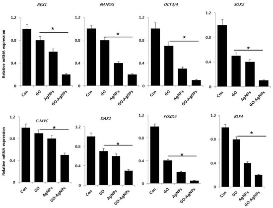 The expression of stem cell-related markers has been found in different cancers, including neuroblastoma [36]. However, the precise role of these stem cell-related genes in tumors is not clear, but Oct4 has been associated with a more immature and aggressive cell phenotype [37]. To further verify the effect of GO-AgNPs on neuronal stem cell markers, SH-SY5Y cells were treated with GO-AgNPs for 24 h and the gene expression of several well-known stem cell markers, including REX1, NANOG, OCT3/4, SOX2, C-MYC, DAX1, FOXD3, and KLF4, was assessed by qPCR. The expression of these stem cell markers was found to be downregulated (Figure 6). Among the tested various stem cell markers, except c-Myc all markers strongly down regulated. Collectively, these results suggest that GO-AgNPs is highly effective in decreasing the self-renewal capacity of SH-SY5Y cells, and in eliminating most neuroblastoma (NB) stem cells. Our findings are line with the observations of Mazzoccoli et al., who found a significant decrease of Oct4 in N-acetylaspartate (NAA)-treated SH-SY5Y cells [36]. Rex1 (zfp42) is a zinc finger protein expressed primarily in undifferentiated stem cells. When murine embryonic stem (ES) cells were treated with all-trans retinoic acid, the expression level of Rex1 was decreased several fold [49]. Nanog is a potential gene for maintaining mouse ES cell self-renewal, which is also regulated by FoxD3, p53 and Oct4. Furthermore, Nanog works together with other key pluripotent factors such as Oct4 and Sox2 to control a set of target genes that have important functions in ES cell pluripotency [50]. Hämmerle et al. reported that RA/MG132 reduces the expression level of the stemness markers such as Oct4, Sox2 and Nanog as well as the neural progenitor markers CD34 and Nestin in neuroblastoma cell lines [51]. Human N-Myc proto oncogene (MYCN) and avian myelocytomatosis virus oncogene cellular homolog (c-Myc) are critical player in the process of proliferation, differentiation and survival of hematopoietic stem cells (HSCs) and cerebellum progenitor cells. Furthermore, the deletion of endogenous MYCN and c-Myc in iPSCs potentially reduces self-renewal capacity, pluripotency and survival, followed by induction of differentiation [51,52,53,54,55]. The knock down of Dax-1, which is an orphan member of the nuclear hormone receptor superfamily induced upregulation of multi-lineage differentiation markers, and produced enhanced differentiation and defects in ES viability and proliferation [56]. FOXD3 plays important roles in biological processes, such as differentiation, proliferation, apoptosis and tumorigenesis [57]. Our results indicate that the significant down regulation of FOXD3 could play an important role in GO-AgNPs induced differentiation in SH-SY5Y cells. Shum et al. demonstrated that Krüppel-like factor 4 (KLF4) suppresses neuroblastoma cell growth; is involved in non-tumorigenic lineage differentiation; and is involved in activation of transcription of many target genes including Nanog, Oct4, p21, p27, Rb, and Sox2. GO-AgNPs significantly down regulate KLF4 gene expression in SH-SY5Y cells [58] (Figure 6). Our data, consistent with previous studies, indicate the involvement of KLF4 in differentiation, and eventually reducing the proliferation of cancer cells. Our results revealed a significant down regulation of Nanog, Oct3/4, Sox2 and other members of stem cell markers by GO-AgNPs, which could reduce the self-renewal capacity of SH-SY5Y cells and increase the differentiation. These observations suggest that GO-AgNPs represents a novel and specific inhibitor of pluripotency by changing gene expression pattern in SH-SY5Y shifted toward a more differentiated phenotype.