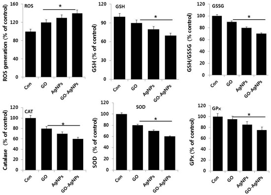 Oxidative stress markers, such as glutathione (GSH), glutathione disulfide (GSSG) superoxide dismutase (SOD), catalase (CAT), and glutathione peroxidase (GPx) activity were assayed with reagents from various kits, according to each manufacturer’s instructions (Sigma-Aldrich). Briefly, the cells were cultured in 75 cm2 culture flasks and exposed to GO or AgNPs or GO-AgNPs for 24 h. The cells were harvested in chilled PBS, by scraping and washing twice with 1× PBS at 4 °C for 6 min at 1500 rpm. The cell pellet was sonicated at 15 W for 10 s (3 cycles) to obtain the cell lysate. The resulting supernatant was stored at −70 °C, until analyzed.