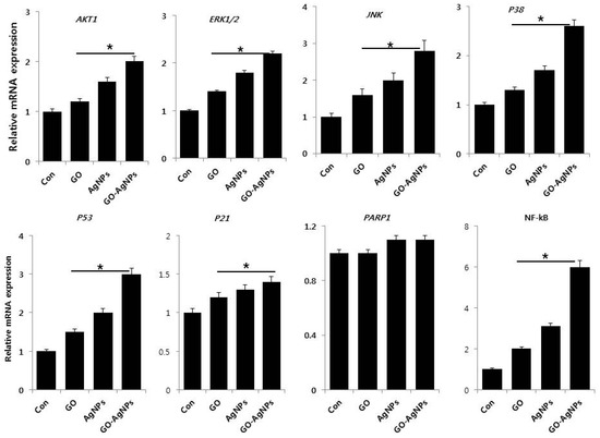 Total RNA was extracted from the cells treated with GO or AgNPs or GO-AgNPs for 24 h using the Arcturus PicoPure RNA isolation kit (Arcturus Bioscience, Mountain View, CA, USA), and then samples were prepared according to the manufacturer’s instructions. Real-time RT-PCR was conducted using a Vill7 (Applied Biosystems, Foster City, CA, USA) and SYBR Green as the double-stranded DNA-specific fluorescent dye (Applied Biosystems). Target gene expression levels were normalized to GAPDH expression, which was unaffected by treatment. The RT-PCR primer sets are shown in Tables S1–S3. Real-time quantitative RT-PCR was performed independently in triplicate for each of the different samples; the data are presented as the mean values of gene expression measured in treated samples versus control [85].