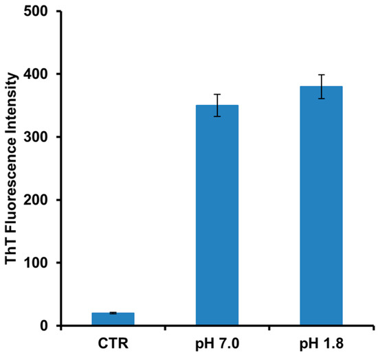 Amyloid fibrils formation in human insulin monitored by ThT fluorescence. Protein was analyzed after 24 h of incubation in aggregating conditions at pH 7.0 and pH 1.8. Control (CTR) refers to the protein in native conditions. Data are expressed as average ± S.D. from five independent experiments carried out in triplicate (p < 0.01). Experimental details are described in the Materials and Methods section.