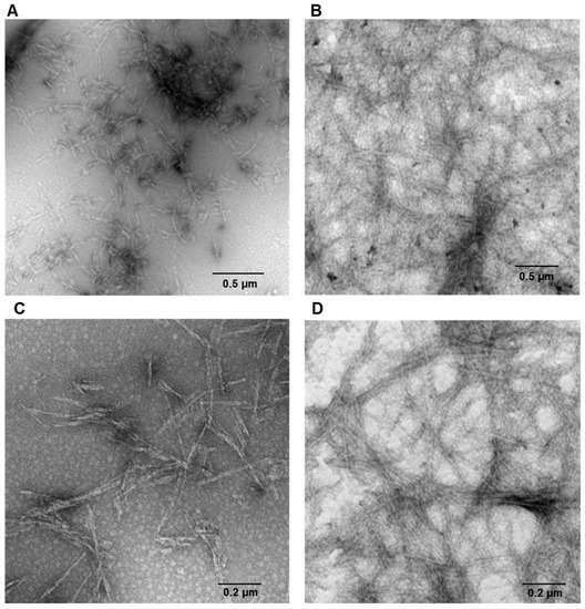 Amyloid fibrils formation in human insulin monitored by TEM. Protein was analyzed after 24 h of incubation in aggregating conditions at pH 7.0 (A,C) and pH 1.8 (B,D). Experimental details are described in the Materials and Methods section.