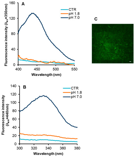 Intrinsic fluorescence properties in insulin fibrils. Emission (panel A) and excitation spectra (panel B) of insulin fibrils formed at pH 7.0 and pH 1.8, in comparison with the protein in native conditions (CTR). (C) TPM image (λex = 750 nm) of insulin fibrils at pH 7.0 (scale bar 10 µm). Experimental details are described in the Materials and Methods section.