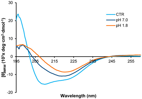 CD analysis of insulin fibrils. Far-UV CD spectra of human insulin after 24 h of incubation in aggregating conditions at pH 7.0 and pH 1.8. CTR refers to the protein in native conditions. Experimental details are described in the Materials and Methods section.