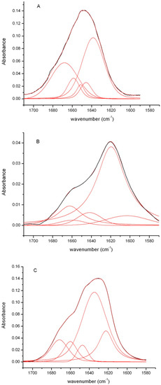 Figure 5 shows the FTIR spectra of insulin fibrils recorded 24 h after the onset of the aggregation reaction at pH 1.8 and 7.0 in comparison with that of the native protein. For the native insulin, the amide I’ band is centered around 1655 cm−1, the shape and the position of this band are consistent with the presence of largely helical structure (Figure 5, panel A) [47]. This result is in agreement with the CD data that clearly show the predominance of helical structure in the native protein. Differently, the FTIR spectra of insulin samples after 24 h incubation in aggregating conditions at neutral and acidic pH showed a large shift of the amide I’ band to lower wavenumbers. In particular, they both showed a shift of the main peak from 1655 to around 1620 cm−1 indicative of the formation of β-structure typically observed in amyloid fibrils (Figure 5, panel B,C) [45,46,47,48]. This result is consistent with the large change observed in the CD spectra indicative of the formation of β-sheet structure. In order to obtain much detailed information on the secondary structure composition, spectra were processed by deconvolution analysis (Table 1).