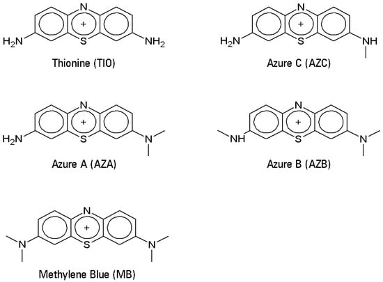 The phenothiazine family comprises—among many other substances—a number of water-soluble cationic blue dyes, sharing the 3,7-diamino-phenothiazinium structure, and largely used as industrial, biomedical, and histological dyes []. The mother compound is called thionine (also known as Lauth’s Violet, TIO), usually sold as the acetate salt. Within the family of the thionines, the two aminogroups can bear methyl substituents, giving rise to Azure C (monomethylated, AZC), Azure A (N,N-dimethylated, AZA), Azure B (trimethylated, AZB), and Methylene Blue (tetramethylated, MB) (Figure 2).