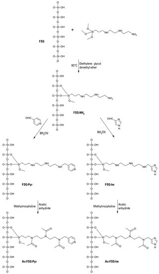 FT-IR spectra showed small but definitive changes following the silanization, as already reported for similar supports [] (Supplementary Figure S5). Particularly, new bands arose around 1550 cm−1 and 2900 cm−1 in FSG-Pyr, possibly deriving from heteroaromatic rings or –NH– bending [].
