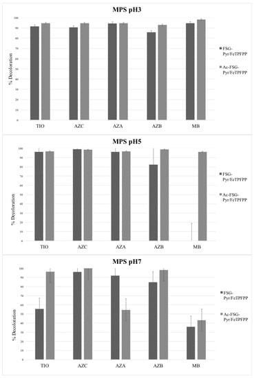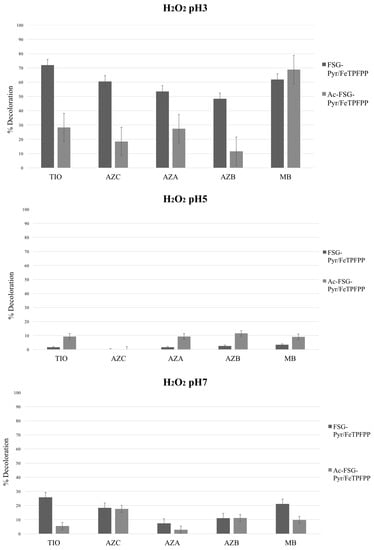 Bleaching experiments were carried out at different pH values and using two oxidizers, i.e., hydrogen peroxide and potassium monopersulfate (MPS). FeTPFPP was used (loading 6.7 μEq/g), immobilized on acetylated or non-acetylated pyridine-grafted supports. Thus, two catalysts were generated, differing by their neutral or cationic character. The results are presented in Figure 7 and Figure 8.