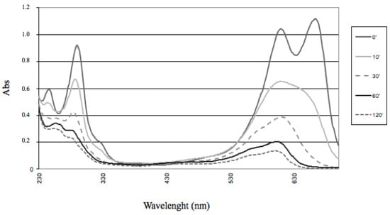 On the whole, thionines were scarcely sensitive to these enzymes. Bleaching was limited and proceeded slowly. Besides this, the substrate specificity of each enzyme was quite narrow compared with the ability of immobilized FeTPFPP to bleach all the tested thionines []. This strongly indicates potential applications of the described biomimetic catalysts in the industrial treatment of complex mixtures of dyes (for example, deriving from a textile factory). The UV–Vis absorption spectral changes of the thionine dyes upon treatment with the enzymes in the presence of H2O2 are shown in the Supplementary Materials Section (Figures S1–S4).