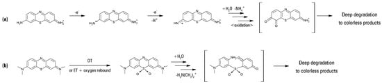 MB lies quite out of this series, being—somewhat surprisingly—a good substrate: therefore, as it does not bear any removable proton, different mechanisms (Electron Transfer, ET or Oxygen Transfer, OT) must operate in this case. In particular, as already found in the case of sulfide ions [] and thioethers [,,,], some redox-active metalloporphyrin oxo-derivatives are well capable of attacking the sulfur atoms, leading to sulfate or to sulfoxides/sulfones, respectively. The lack of any removable proton in the MB molecule could drive the catalyst action toward such a direct attack to the sulfur atom, therefore breaking the electron delocalization along the thionine nucleus with concomitant absorption loss in the visible region. This hypothesis is corroborated by the early observation by MacNeal et al. [] who noted the facile oxidation of MB to the corresponding sulfone by an oxidant as feeble as FeCl3. Very recently, Mesquita et al. [] have found a sulfoxide intermediate along the oxidative degradation of MB in heterogeneous Fenton-like conditions. Especially in the case of the arising sulfone, the strong electron-withdrawing effect should activate the immonium-bearing ring toward nucleophilic attack (by water) and subsequent fast oxidative/hydrolytic disintegration (Scheme 1, path b).