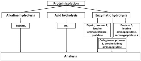 The overview of protein hydrolysis workflows (alkaline [99], acid [19,115] and enzymatic [19,115,116]), compatible with subsequent chromatography-based analysis. Concentrations: Ba(OH)2, 1.7 mol/L [99]; HCl, 6 N [19,115]; pronase E, two additions of 0.3 unit [19], 400 PU [115], 20 μg [116]; leucine aminopeptidase, 1unit [19], 0.4 unit [115]; carboxypeptidase Y, 0.95 unit [19]; pepsin, 1 FIP-U [115]; prolidase, 1 unit [115]; collagenase, 0.04 mg/mL [116].