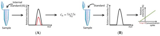 In contrast to the experiments performed in a full MS mode, MRM represents a method of highly-sensitive targeted analysis [154]. Accordingly, it can be applied to a limited number of analytes, but each of them can be detected with a high precision, accuracy and sensitivity [76]. Thereby, due to the recent improvement of the QqQ instrumentation and introduction of so-called “scheduled MRM” algorithm, which allows quantification of more than 500 analytes in one experiment [155], the power of the MRM-based targeted MS analysis dramatically increased. Moreover, introduction of the ultra-high performance liquid chromatography (UHPLC) technique in 2000s [156,157], allowed development of high-throughput quantitative LC-MS/MS-based methods, requiring in some cases only five minutes analysis times [158]. However, the most important (if not the critical) improvement of the LC-MS/MS-based quantification methodology was done by combining it with the stable isotope dilution technique [139]. This approach (Figure 4A) allows direct determination of analyte concentration (CA) in experimental samples based on the ratio of analyte (SA) and internal standard (SIS) peak areas, multiplied by the concentration of the stable isotope-labeled internal standard (IS) spiked to the sample (CIS) [159]: