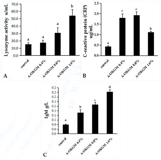 As is shown in Figure 1, the CRP levels in fish fed the A-OKGM diets were significantly higher (p < 0.05) than those in the control group, regardless of the dosage. The IgM contents were significantly increased by the A-OKGM diets (p < 0.05), with the highest IgM level observed in the 0.8% A-OKGM diet group. Lysozyme activity in fish fed the 1.6% A-OKGM diet was significantly increased (p < 0.05). However, the lysozyme activity did not significantly vary among the other groups.