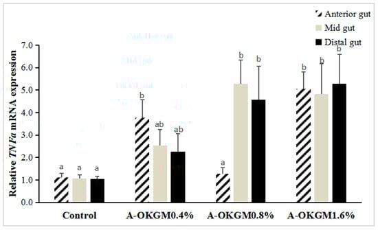 Because TNFα can eradicate various pathogens by activating the cellular response, TNFα is regarded as an important biomarker to indicate the health status of both mammals and fishes [,,]. Many studies have reported that polysaccharides induce the expression of TNFα mRNA. In mammals, the TNFα expression in rats fed with Grifola frondosa polysaccharide was markedly increased []. In carp, Yuan et al. [] reported that administration of Astragalus polysaccharides significantly up-regulated TNFα mRNA in carp. Similarly, Immunogen (mainly β-glucan and MOS) significantly enhanced TNFα gene expression in rainbow trout []. In the present study, in the anterior gut, the 0.4% and 1.6% A-OKGM diet groups showed significantly enhanced TNFα gene expression. Additionally, diets supplemented with 0.8% and 1.6% A-OKGM significantly promoted the expression of TNFα in the mid- and distal guts.