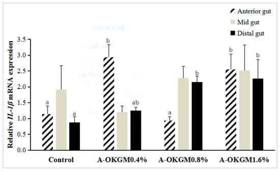 In the anterior intestine, the expressions of IL-1β in fish fed with 0.4% and 1.6% A-OKGM diets was significantly increased (p < 0.05) when compared with that in the other groups. However, the increase in IL-1β expression in the mid-intestine did not reach significance (p > 0.05). In the distal intestine, the 0.8% and 1.6% A-OKGM diets significantly promoted (p < 0.05) the expression of IL-1β. These results are depicted in Figure 3.