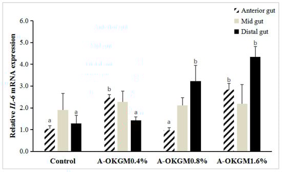 In the anterior intestine, IL-6 expressions in the fish fed 0.4% and 1.6% A-OKGM diets was significantly higher (p < 0.05) than that in the control group (Figure 4). However, in the mid-intestine, there were no significant differences (p > 0.05) in IL-6 mRNA levels among any of the groups following the feeding trials. In the distal intestine, the expressions of IL-6 in fish fed the 0.8% and 1.6% A-OKGM diets was significantly higher (p < 0.05) than that in the control group.