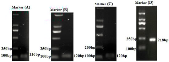 The amplification products of RT-PCR. Marker: DL2000, (A) TNFα, (B) IL-1β, (C) IL-6, (D) β-actin.