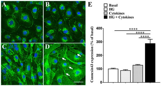 Figure 1 shows that high glucose (HG) (88.34 ± 6.05%) did not change connexin43 levels relative to the control (100.00 ± 5.51%; p = 0.9569) (Figure 1A,B). Similarly, pro-inflammatory cytokines (127.50 ± 5.81%) did not significantly increased connexin43 expression relative to the control (p = 0.6490) (Figure 1A,C). On the contrary, a combination of HG and cytokines (288 ± 31.28%) significantly increased connexin43 levels relative to the control, HG alone, and cytokines alone (p < 0.0001 for all) (Figure 1A–E). Additionally, there was a change in cell morphology following combination treatment with HG and cytokines (white arrows, Figure 1D) with cells appearing edematous possibly owing to hemichannel opening. The combination of HG and cytokines also lead to cytoplasmic connexin43 expression, which differed from the cell membrane localization seen in basal conditions as well as treatment with HG or cytokines alone.