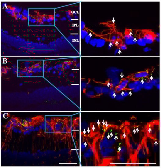Connexin43 and glial fibrillary acidic protein (GFAP) expression in retinas of (A) wild-type; (B) Akita; and (C) Akimba mice. Connexin43 spots (green) were present in the GCL and co-localized with GFAP (red) in all mouse strains. GFAP labeling was evident within the GCL only in wild-type and Akita but spanned all retinal layers in Akimba mice. GFAP = glial fibrillary acidic protein; White arrows highlight connexin43 spots. GCL = ganglion cell layer; IPL = inner plexiform layer; INL = inner nuclear layer. Scale bar: 50 µm; n = 4 animals/group.