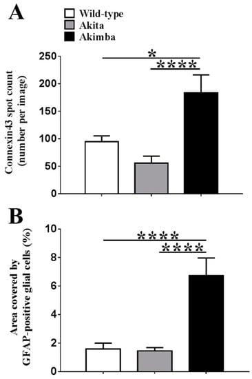 2.2. Connexin43 and Glial Fibrillary Acidic Protein (GFAP) Expression Increase in Akimba Compared to Wild-Type and Akita Retinas