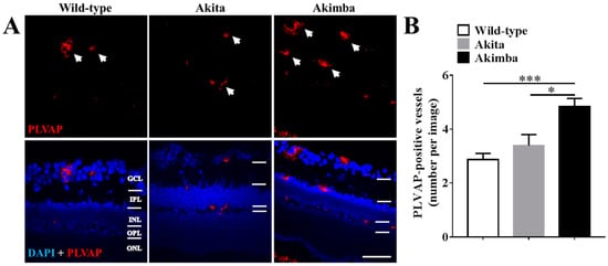 PLVAP-positive vessels in wild-type, Akita, and Akimba mice. (A) PLVAP (red) expression within retinal layers in wild-type, Akita, and Akimba mice. PLVAP-positive vessels are indicated by white arrows. GCL = ganglion cell layer; IPL = inner plexiform layer; INL = inner nuclear layer; OPL = outer plexiform layer; ONL = outer nuclear layer. Scale bar: 50 µm; (B) Quantification of PLVAP-positive vessels shows that there was no difference in vessel number between wild-type and Akita retinas (p = 0.4511). However, there were more PLVAP-positive vessels within the retina of Akimba mice compared to wild-type (p = 0.0005) and Akita (p = 0.0154) mice. Data presented as mean + SEM. Statistical comparisons were carried out using one-way ANOVA with Tukey’s multiple comparisons test; n = 4 animals/group; * p ≤ 0.05, *** p ≤ 0.0001.