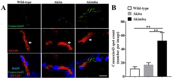 As DR is primarily a chronic inflammatory vascular disease, it was important to evaluate changes in connexin43 expression within blood vessels specifically. PLVAP has previously been described as an endothelial cell-specific marker of newly formed blood vessels in mice []. However, before assessing connexin43 expression in blood vessels, the number of PLVAP-positive cells were compared between the three mouse strains to determine the extent of neovascularization (Figure 4). Results showed that there was no difference in PLVAP-positive vessels between retinas from Akita (3.4 ± 0.9) and wild-type (2.9 ± 0.6; p = 0.4511) mice. However, Akimba (4.8 ± 0.8) retinas had more PLVAP-positive vessels compared to wild-type (p = 0.0005) and Akita (p = 0.0154) retinas.