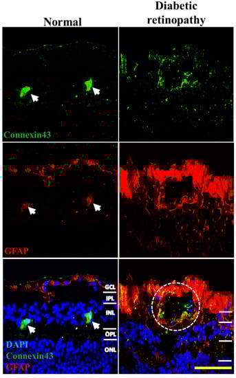Connexin43 (green) and GFAP (red) expression in normal and human DR donor retinas in regions of extensive vascular damage. Large cells (white arrows, left column) represent non-specific auto-fluorescent amacrine cells. Connexin43 expression was markedly higher in the GCL of DR donor tissues compared to age-matched controls, and was strongly expressed throughout all retinal layers. GFAP labeling was also markedly higher in DR compared to normal donor eyes representing hyper-reactive Müller cells. Connexin43 expression was increased in regions identified as blood vessels and correlated with increased GFAP labeling at these sites, indicating glial cell activation (white circle). GCL = ganglion cell layer; IPL = inner plexiform layer; INL = inner nuclear layer; OPL = outer plexiform layer; ONL = outer nuclear layer. Scale bar: 200 µm.