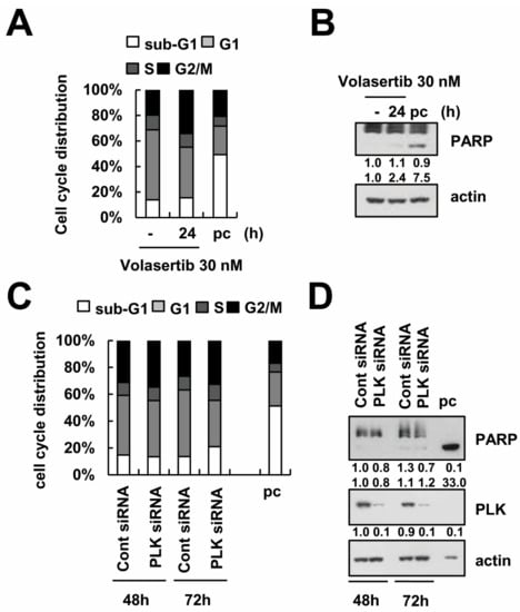 The effect of volasertib on cell cycle distribution and apoptosis in Caki cells. (A,B) Caki cells were treated with 30 nM volasertib for 24 h. The DNA content was analyzed by flow cytometer (A). The expression of PARP and actin were determined via Western blotting (B). (C,D) Caki cells were transiently transfected with control siRNA (Cont siRNA) or PLK siRNA for the indicated time periods. After transfection, the DNA content was analyzed with a flow cytometer (C). The protein levels of PARP, PLK, and actin were determined via Western blotting. The level of actin was used as a loading control (D). P.C.: positive control (10 ng/mL TNF-α plus 5 μg/mL cycloheximide for 14 h).